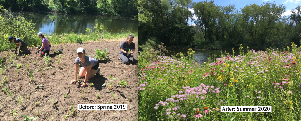We then got our hands dirty planting 150 native prairie wildflowers and mulching the area. This diverse wildflower planting will provide a nectar and pollen source for butterflies and other pollinators from May to October. Thanks to Erin Dentice and Jessica Maxwell for there leadership at Milwaukee Parkside and our amazing student volunteers from MUHS. We look forward to several planting projects with Milwaukee Parkside School for the Arts this Spring.
