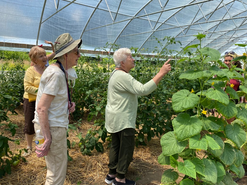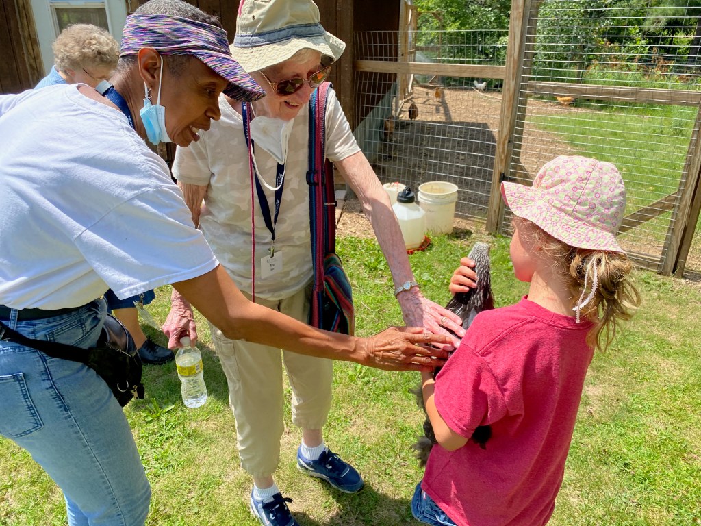 Following the Mass was a reception and social in St. Francis Hall and with beautiful Fall weather, many enjoyed time on our deck taking in the sights and sounds of this amazing time of year! Our executive director, Joe Meyer, took the Archbishop, the Archbishop’s mother and Fr. LoCoco on a golf cart tour of the CEC property including Clare Gardens Organic Farm…Yes, they were able to pet our holy hens, Peter and Paul the goats and Loretta (“Larry”) the pig!