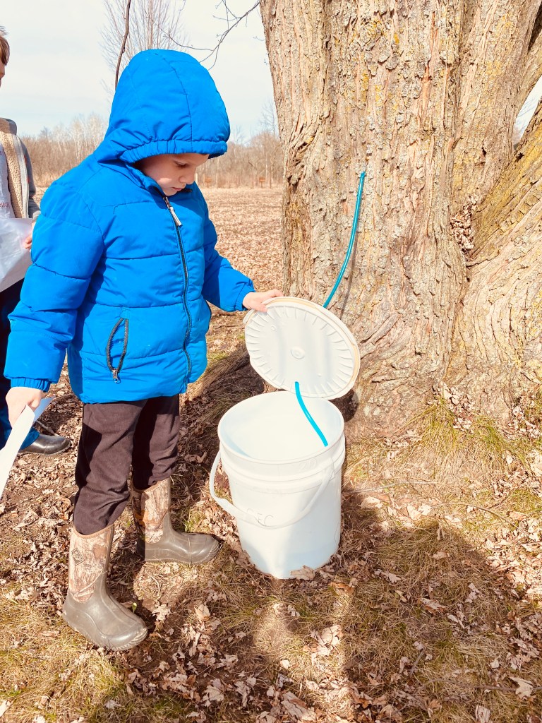 It’s pretty incredible the way the tree uses its sap in its own closed system, but it’s downright remarkable to see what a gift it can be for us too! Humans have been collecting sap for hundreds of years. Early Native Americans and settlers used tools like wooden spiles and birchbark baskets to harvest the sap, but oftentimes today the tools look a little bit different.