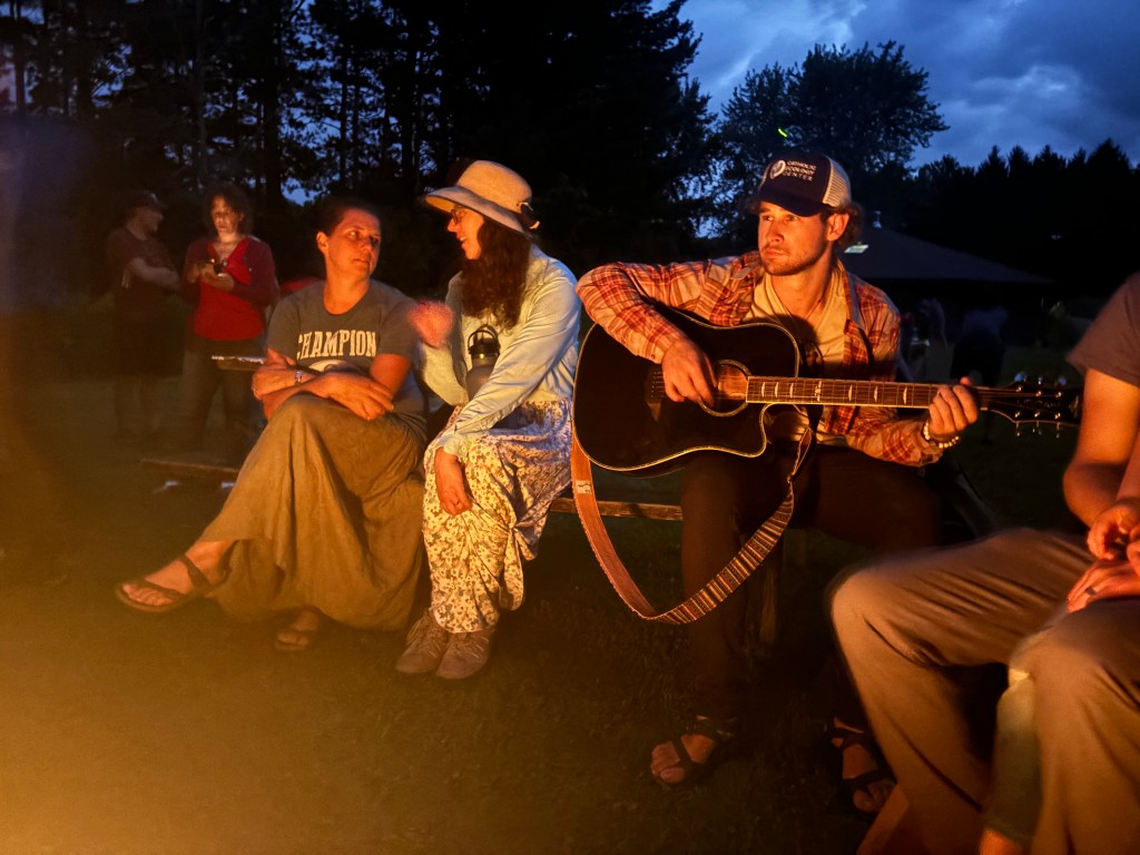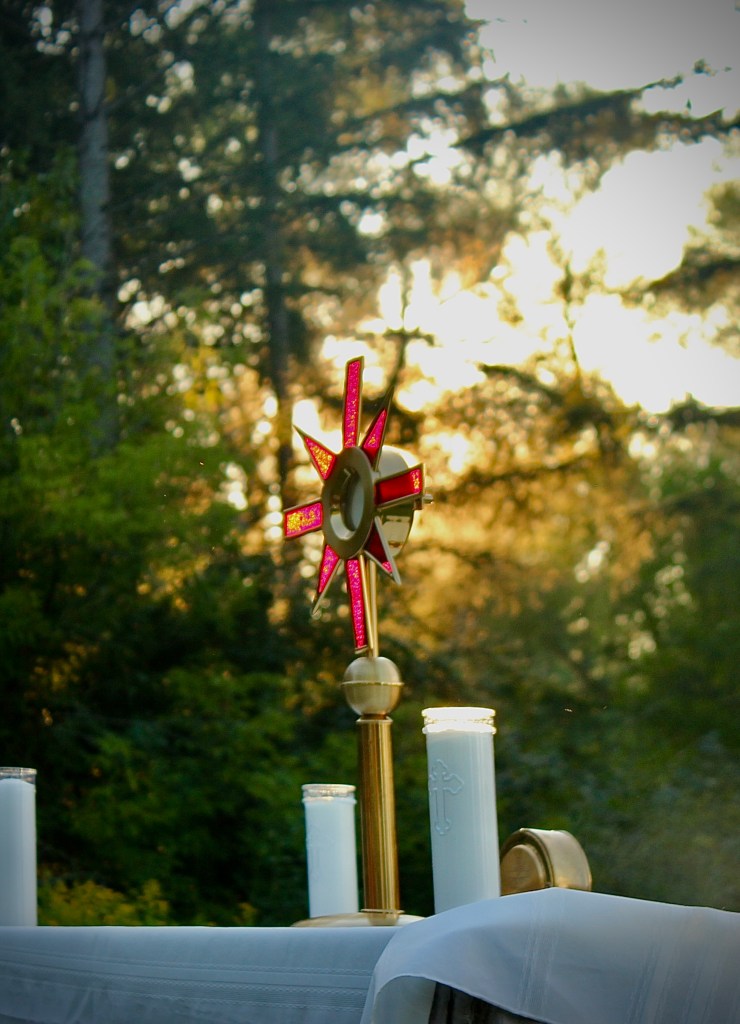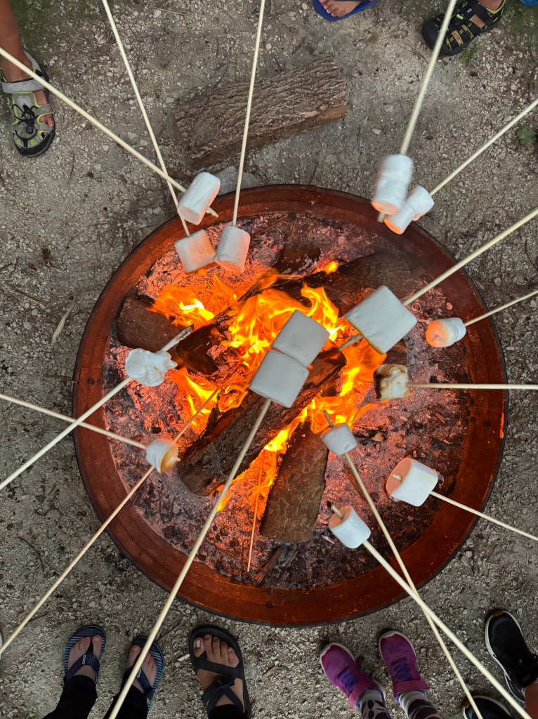 After supper, people headed to our Holy Family Chapel for spiritual nourishment through confession and adoration led by Fr. Michael Joseph. It was humbling to see young and old alike gathered in such peace and reverence, connecting with our Lord in this intimate way. The night continued with more fun by the campfire as the sun set and night sounds surrounded us.