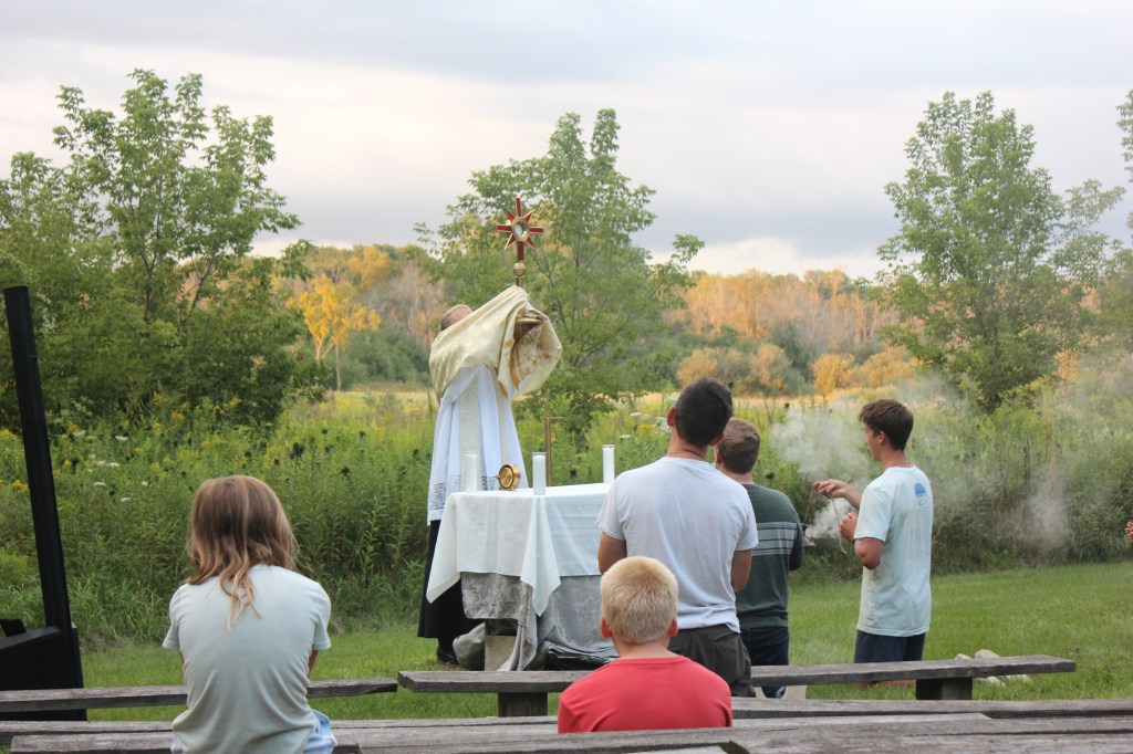 After supper, people headed down to the amphitheater for spiritual nourishment through confession and adoration led by Fr. Jacob Strand. The golden rays of sunlight shining down on the monstrance through the dark green pine boughs and grassy meadow beyond provided a radiant backdrop that extolled the glory of God as Jesus graced us through His presence in the Eucharist. It was humbling to see young and old alike gathered in such peace and reverence, connecting with our Lord in his stunning creation.