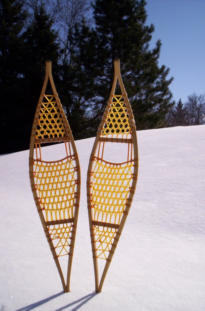 Left: Traditional Ojibwe Snowshoes made of White Ash and Rawhide. The pointed tips help to break through icy, crusty snow and avoid snagging in brush.