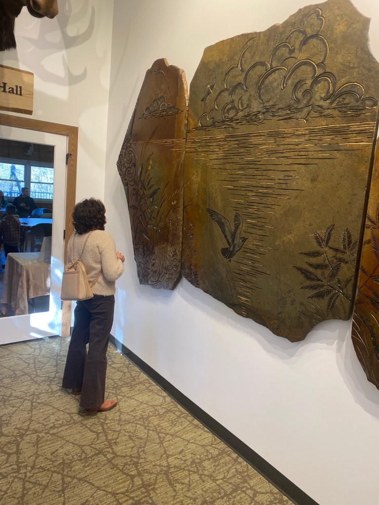 The creation of the piece was no small feat! Come and visit the CEC to see it on display and you can read all about the “ stone cowboys”- the skilled men who worked hard and diligently to quarry the ancient, incredible rock slab off the walls of a Montana cliffside. The stone alone is an incredible marvel, a piece of metamorphic slate that geologists estimate is over 1 billion years old! Additionally, the two stones on each side of the tryptic showcase an extremely rare occurrence known as “ book matching”, where the natural break in the rock created the two pieces that are symmetric to each other.