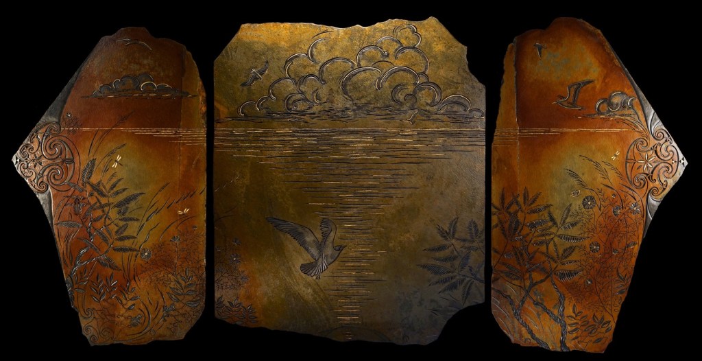 After the stone was obtained, there were sketches, lots of conversations, and hours upon hours of work put in by Sam. All the carving was done using hand-held tools with diamond and garnet grit as an abrasive cutting edge. Aside from the 24 karat gold leaf, there is no other pigment used in the work. Carving through the layers of rock naturally revealed the dark unoxidized black interior of the rock, providing incredible, natural contrast and definition.